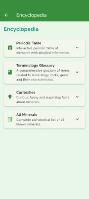 Med My Mineral List får du adgang til et væld af funktioner designet til at berige din viden. Udforsk en omfattende database med 6.006 kendte mineralarter, komplet med detaljerede beskrivelser, kemiske sammensætninger, krystalstrukturer og fysiske egenskaber som hårdhed og glans. Dyk ned i et interaktivt periodisk system, der belyser de mineralelementer, og udvid dit ordforråd med en teknisk ordliste indeholdende over 500 fagtermer. Hvert mineral præsenteres med fascinerende fakta, information om dannelsesprocesser og geologiske forekomster samt deres historiske og kommercielle betydning, ofte beriget med indsigt fra Wikipedia.
